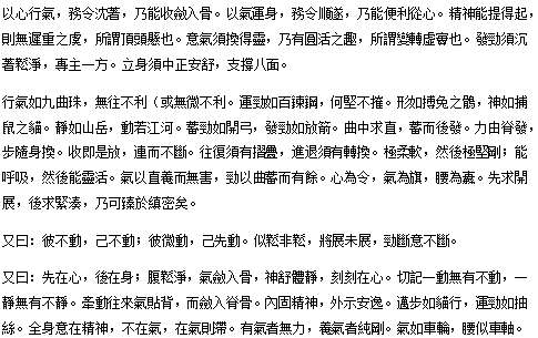 También se dice: primero en el Xin (corazón-mente), luego en el cuerpo, el abdomen está relajado y claro (recogido), de manera que el Qì se condense en los huesos; el espíritu es cómodo y el cuerpo está en calma; recuerda esto en el corazón en todo momento. Recuerda: una parte se mueve, todo se mueve una parte se detiene, todo se detiene. La mente guía el flujo de Qì adelante y atrás, adhiriéndose a la espalda, y luego condensándose en la espina dorsal; fortalece el espíritu de la vitalidad (Jing-Shén) internamente y expresa externamente pacífica y sencillamente.