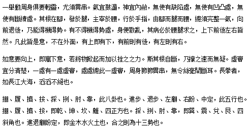 Una vez en movimiento cada parte del cuerpo está ligera y ágil y ha de ir unida la una con la otra. El qì debería ser pleno y animado, el Shén (espíritu) debería retenerse internamente. Ninguna parte debería ser defectuosa, ninguna parte debería ser deficiente o excesiva, ninguna parte debería estar desconectada. La raíz está en los pies, la fuerza se genera desde las piernas, se controla por la cintura y se expresa con los dedos. Desde los pies a las piernas a la cintura debe haber un Qì integral y unificado. Cuando uno se mueve hacia delante o hacia atrás puedes aprovechar la oportunidad y conseguir una posición ventajosa. Si fallas a la hora de aprovechar la oportunidad y conseguir la posición superior tu mente se dispersará y tu cuerpo se desordenará. Para solucionar este problema tienes que mirar a la cintura y a las piernas. Arriba y abajo, delante y atrás, izquierda y derecha, es todo lo mismo. Todo esto se hace con la mente, no externamente. Si hay un punto superior hay un punto inferior, si hay una parte frontal hay una parte trasera, si hay izquierda hay derecha.